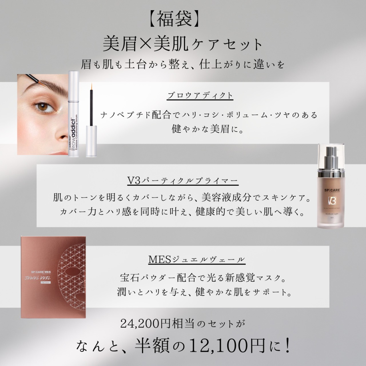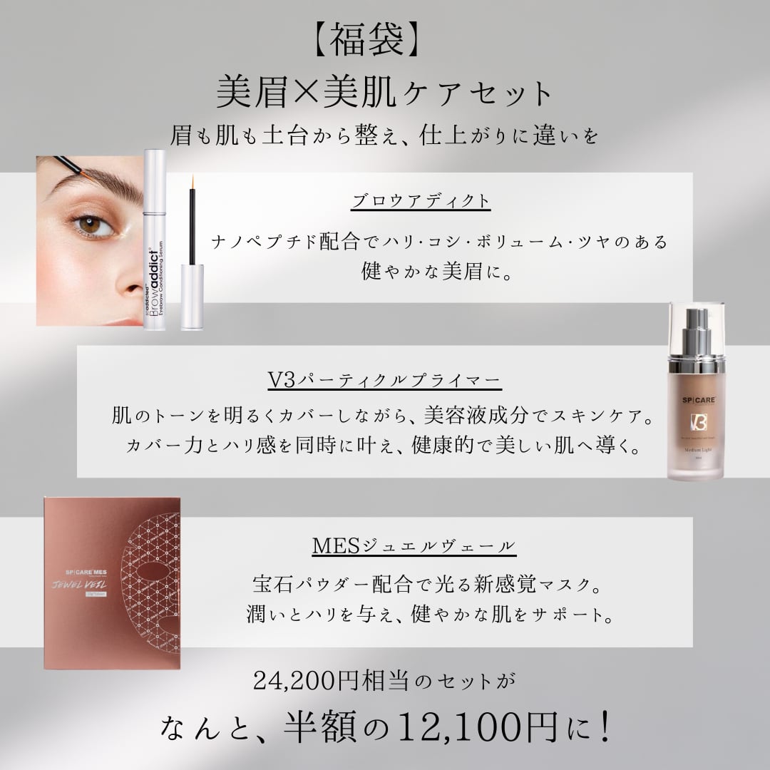 ブロウアディクト、V3パーティクルプライマー、MESジュエルヴェールをセットにした、美眉と美肌を同時に叶える特別なセットです。